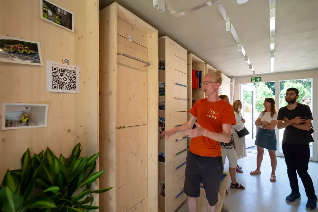 Für den Bau von Möbeln und der Küche setzte das CoLLab Team die Naturholzplatte vita von elka ein. Besonders das modulare Schrankssytem im Küchenbereich fiel dabei auf.
