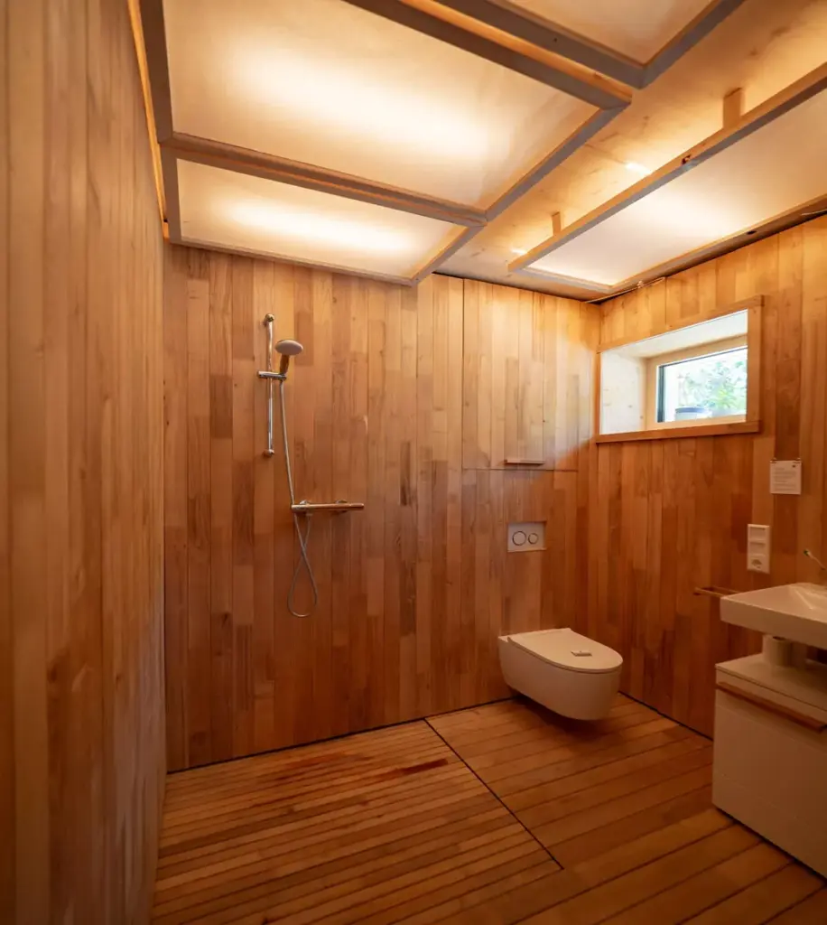 Aber das Team X4S hatte sich auch einige technische Besonderheiten ausgedacht. Hängengeblieben sind die Niedervolt-Stromversorgung mit im Raum verteilten stromführenden Schienen und einem selbst entwickelten Stecksystem oder die Fenster mit innenliegenden Jalousien, die man durch einen zu öffnenden Glasflügel reinigen und warten kann. Beeindruckend war auch das holzvertäfelte Badezimmer.